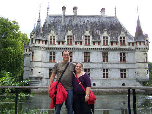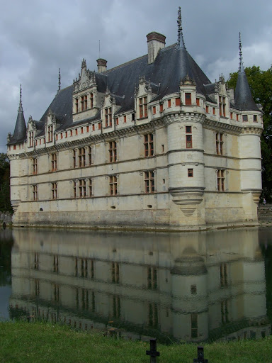 Estuvimos unas 2h. en este castillo, sólo el paseo por los jardines lleva 3/4 de la visita. Salimos con ganas de tomarnos un algo, nos acercamos al primer chiringo que encontramos, pagamos los 5,60€ de rigor por dos coca colas... de 33cl. y botella de cristal, eso si, y continuamos ruta. La lluvia comenzó a arreciar por primera vez en el día, hasta ahora había "barruzado" nada más un poquito de vez en cuando. Seguimos guiados por el Tom Tom que, esta vez, nos lleva rauda y correctamente hasta el segundo castillo que visitamos, el de Azay le Rideau, que se encuentra en un pequeño pueblo que debe vivir de poco más que el propio castillo.