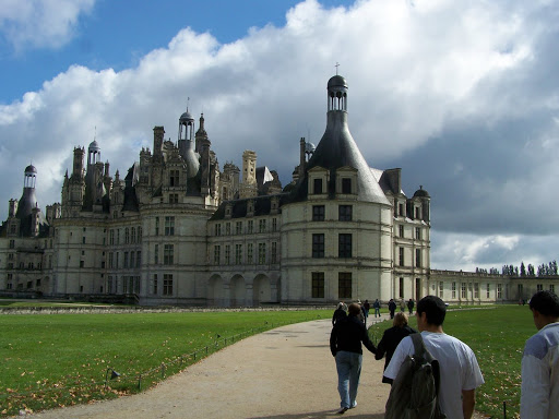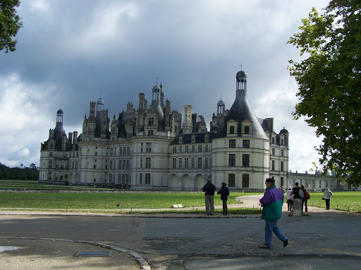 Chambord, Chambord era el último castillo a visitar y vaya si lo fue. Para empezar decir que el GPS nos guiaba hacia un sitio y sin embargo por todos lados veíamos indicaciones del castillo que nos llevaban a otros sitios... estabamos ya mosqueados cuando la voz del GPS nos dijo "A (pausa) 500 (pausa) metros (pausa) gire a la izquierda" y efectivamente había una señal que indicaba Castillo de Chambord. Entramos y depués de unos 500m. vemos una señal que reza "Dominios de Chambord" (en perfecto francés claro). Dominios???... Entramos por una carretera limitada a 60km/h. sin rayas que nos llevaba por los dominios de Chambord, nos pasó una furgoneta como un tiro que nada más pasarnos frenó un montón y puso el intermitente izquiero... coño!! un jabalí en la cuneta. Después de un par de kilómetros llegamos a una zona donde nos dirige a un parking de pago. 45 minutos gratis, 3€ todo el día. Aparcamos y nos acercamos a lo que parece la entrada... Esto es un pueblo!!! Pues si, llegamos a una zona con restaurantes y la venta de tickets y, al fondo, el espectacular castillo de Chambord.