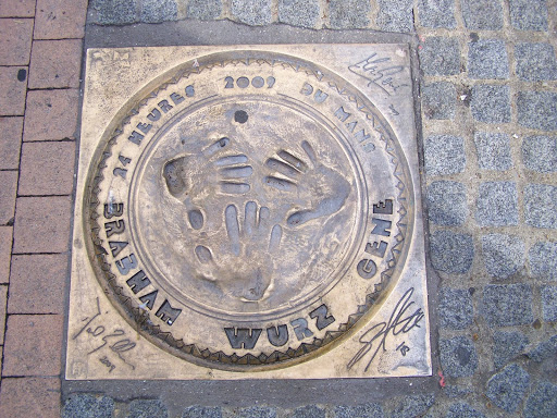 Decidimos tomarnos un café porque estábamos "aterecidos" de frío, elegimos un café que estaba en la misma plaza donde debían estar abriendo porque los camareros entraron con nosotros. Una vez tomado el café y entrados en calor, nos dimos un paseo buscando la oficina de información, aunque acabamos encontrando la plaza donde está el monumento a los ganadores de Le Mans. Cada año hacen una placa de bronce con los nombres y las manos de los ganadores de la carrera y la ponen en el suelo de la plaza.