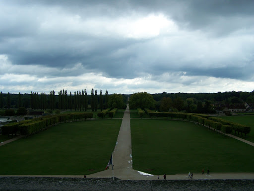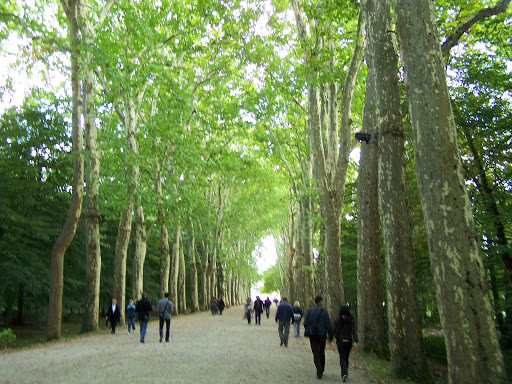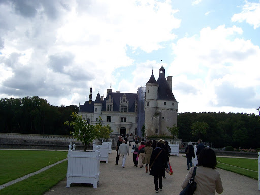 Cuando salimos del castillo y tras tomarnos una coca-cola continuamos ruta hacia el siguiente, Chanonceau (o algo). Aquí el GPS de nuevo hizo de las suyas y nos quiso meter por el bosque por una entrada que no existía, que, efectivamente era la parte de atrás del castillo. Llegamos a él y ya vemos que, aparte que el castillo no se ve, hay mucha gente para verlo, cosa que hasta ahora no había sido habitual. También tiene parkings grandes para coches, caravanas, bicis, motos y autobuses, lo que nos lleva a pensar que este algo más conocidillo sí que tiene que ser. Una vez comprada la entrada en una especie de cajero, recorremos un paseo de árboles (la foto está un poco movida...)